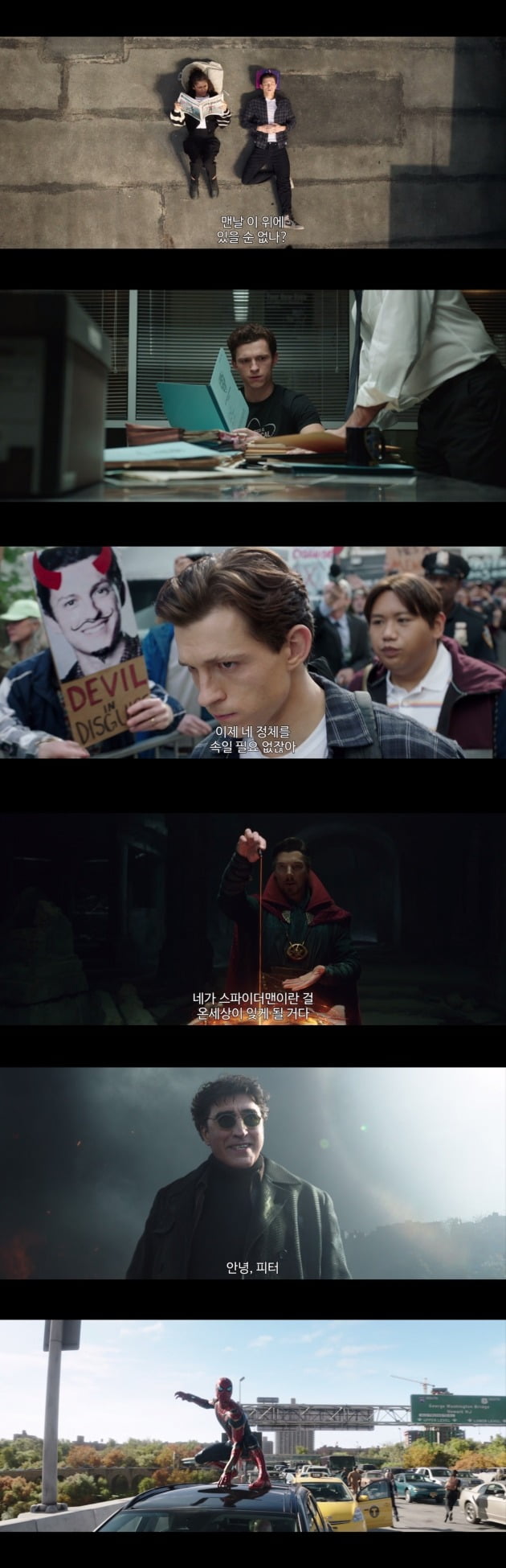 첫 번째는 스파이더맨의 정체가 피터임이 공개된 직후 도망가는 그들의 옆에 보이는 전광판인데요.