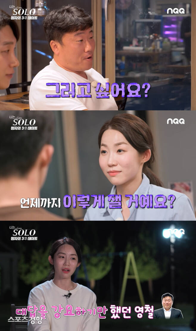 둘째 날, 영철은 정순(32)이라는 여성분과 연결됐는데요. 그런데 데이트하러 밖으로 나가지 않고 영철은 육포와 사이다를 준비한 다음에 정순을 공동 거실로 불렀습니다. 정자가 이런 상황에 기분 나빠하는 기색을 보이자 그는 “좋아하지 않았던 남자가 나왔으니까 육포를 씹어서 스트레스를 풀라”고 말했습니다.